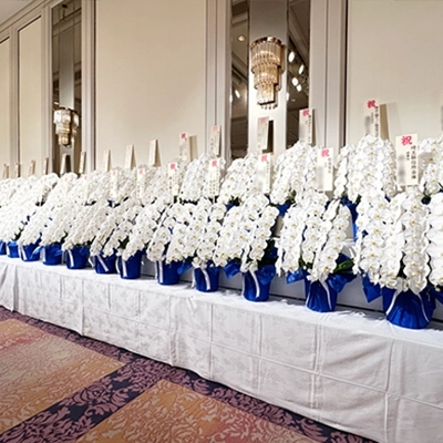 記念式典はホテルのパーティー会場で開催されましたので、式典前が始まる前に胡蝶蘭をすべて飾らせて頂き、終了後その日のうちに回収させて頂きました。胡蝶蘭のラッピングは山崎工務店様のコーポレートカラーの青色で統一感を持たせました。