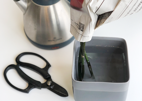 茎に付着している保水ゼリーを洗い流してから茎元を斜めに切り、お花の給水を良くします。
