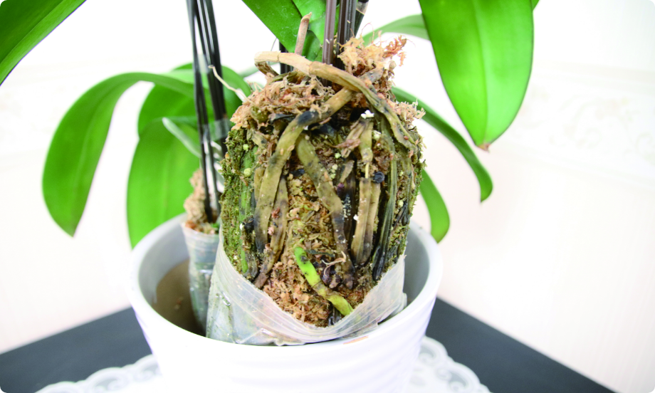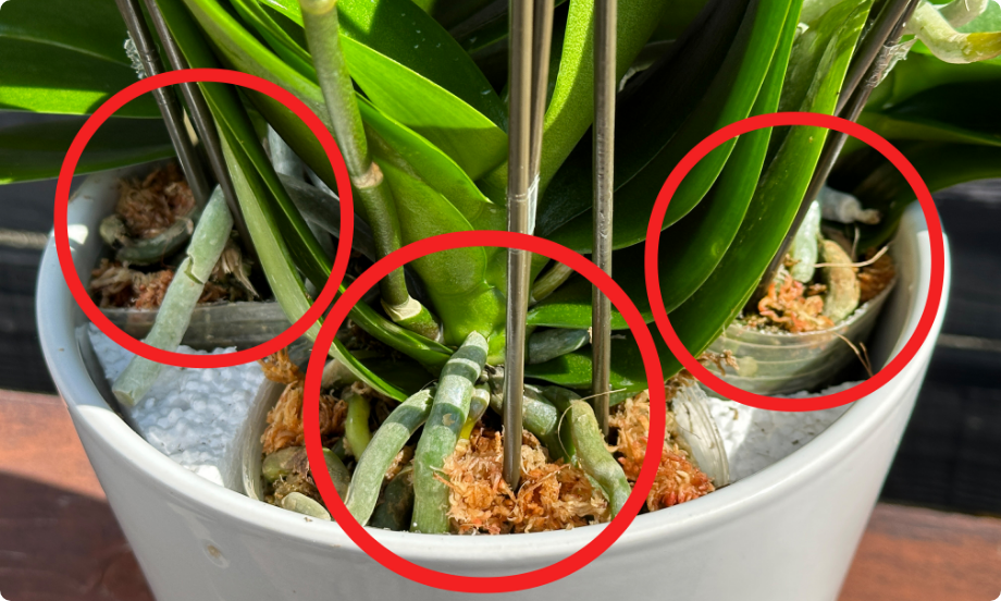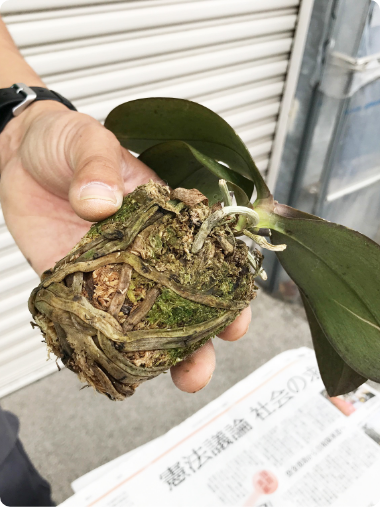 <目安:1週間~10日に1回程度>胡蝶蘭は株がポットに入ったまま植わっています。写真は3本立ちの胡蝶蘭なので3つの株があります