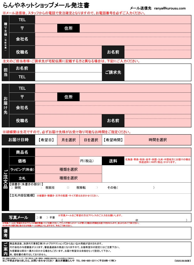 メールでご注文いただく場合、通常のネットショップからご注文いただく場合と異なる点がございます。