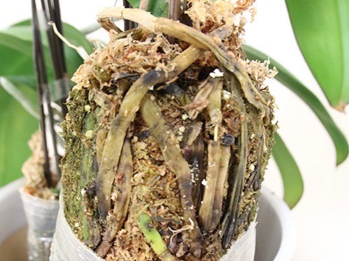 - 根を傷つけないように慎重に古い植え込み材を取り除き、傷んだ根や黒ずんだ根は切り落とします。