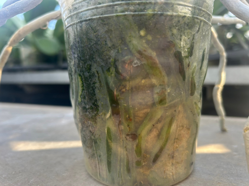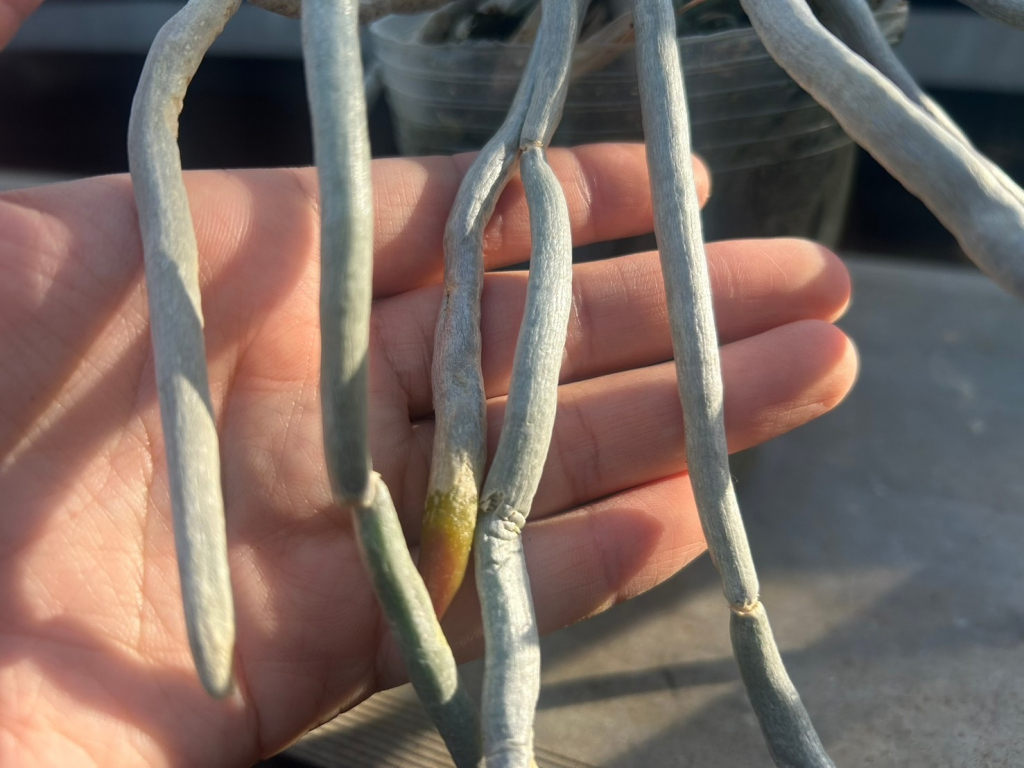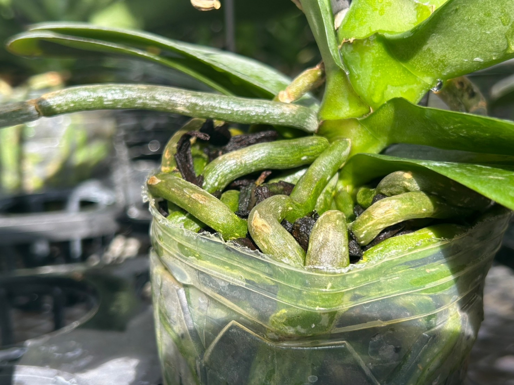 胡蝶蘭の根は、私たちが普段目にする観葉植物の根とは全く異なる特徴を持っています。その表面を覆っている銀白色の組織は、「ベラメン」と呼ばれるものです。