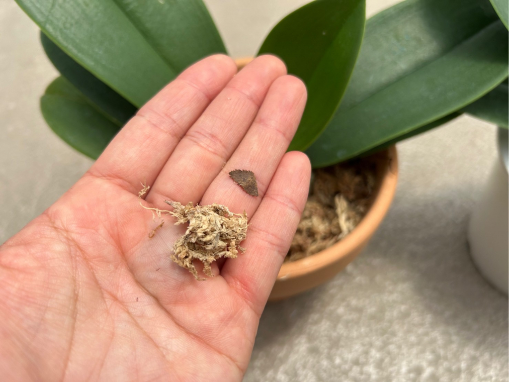 植え込み材(水苔)の色と感触: 水苔が完全に乾燥し、白っぽくなっているのを確認してから水やりをします。手で触ってみて、カサカサと乾いている状態が目安です。