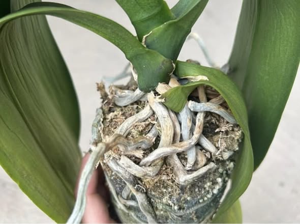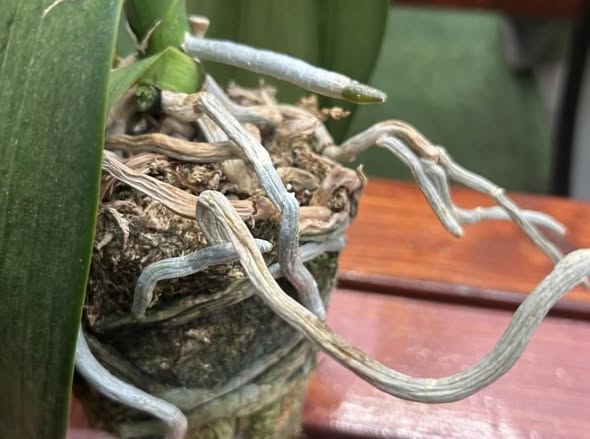 胡蝶蘭の根は、水を吸うと“緑色”になります。乾燥が続くと、銀白から灰色になります。