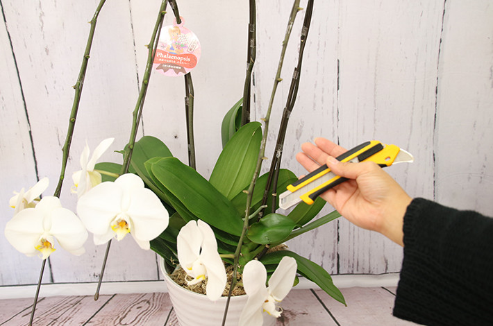 ※花がまだ3分の1ほど残っている状態で花茎を切り落として、二度咲きチャレンジの準備をします。花が全て枯れてしまい期間がたつとステム(花茎)も枯れてしまい、二度咲きが難しくなります。そこで早い段階で花を切ってあげることで、二度咲きしやすくなります。ステム(花茎)を切る前にカッターなどは火で炙ったり、アルコールで消毒したりして、病原菌の侵入を防ぐようにしましょう